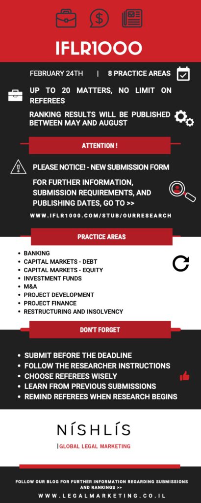 השנה 1000IFLR פרסמו פורמט חדש לטופס הממליצים, בחרו ממליצים בקפידה. לקוחות אותם המשרד מלווה במשך שנתיים לפחות, זמינים, המכירים את צוות המשרד ויכולים לדבר בשבחכם.
